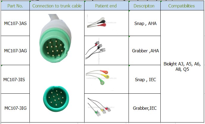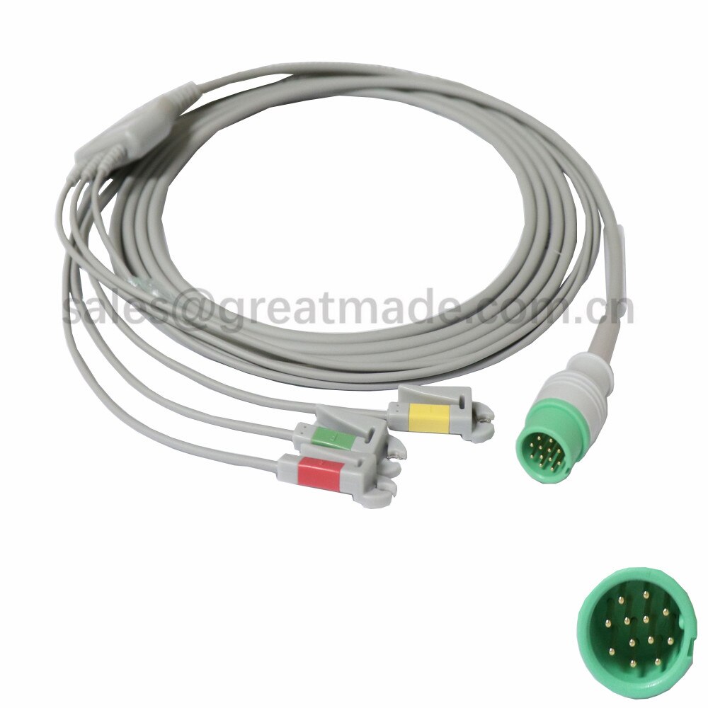 متوافق مع كابل تخطيط القلب Biolight A3 ، A5 ، A6 ، A8 ، Q5 مع leadwiresie. IEC ، 3 الرصاص ، المختطف ، 12pin الأخضر