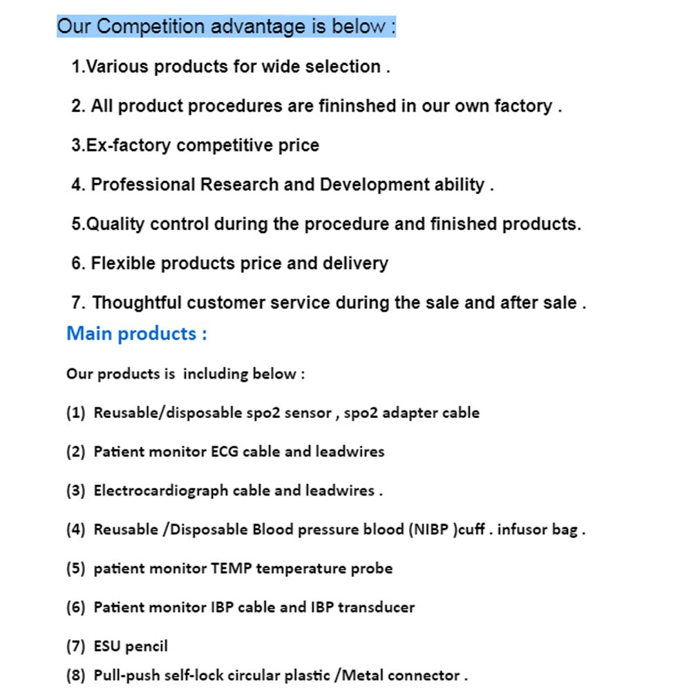 شركة Shenzhen Greatmade Tech LTD هي شركة متخصصة في تصنيع الكابلات الطبية ، والتي تستخدم على نطاق واسع مع جهاز مراقبة المريض متعدد المعلمات ، مقياس تأكسج النبض ، جهاز EKG ، جهاز ضغط الدم ، وحدة الجراحة الكهربائية. لدينا 10 سنوات خبرة في هذا المجال. لدينا مصنع الخاصة بنا فى شنتشن البر الرئيسى للصين ، ولها جهاز تصنيع واختبار جهاز كامل. نحن أيضا بناء فريق البحث والتطوير المهنية لتلبية حاجة السوق المختلفة. لدينا الجودة العالية والسعر المفيد والخدمة مدروس وفاز دعمنا الدائم لعملائنا الوطنيين والدوليين.
